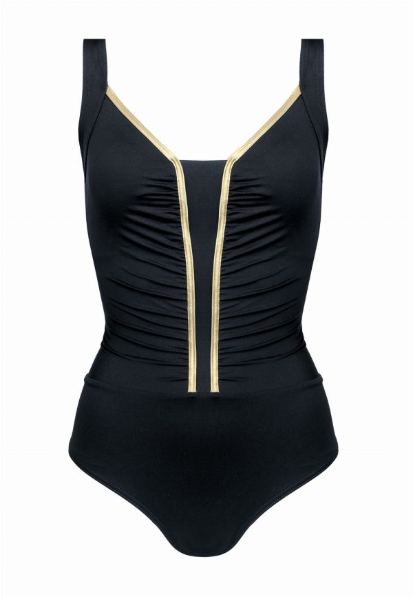 Discover Perfection – Shaping One-Piece with Decorative Ruffles and Gold Trim