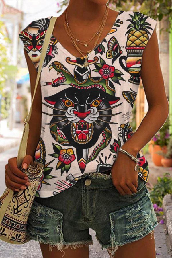 Women’s Vintage Tiger Tattoo Printed Sleeveless Tank Top
